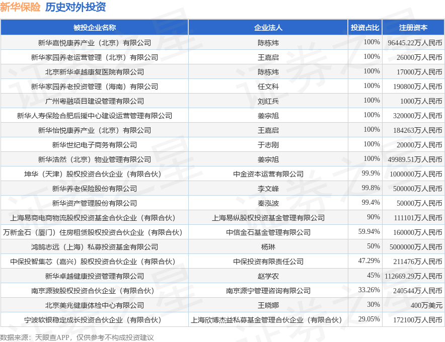本站消息,根据天眼查APP显示,新华保险(601336.SH)新增一起对外投资事件点点盈,被投资公司为北京控股有限公司,法定代表人Zibo Hou,投资占比为6%。该公司从事,注册资本为。目前,新华保险共存在对外投资90项点点盈,投资占比前20的项目见下表: